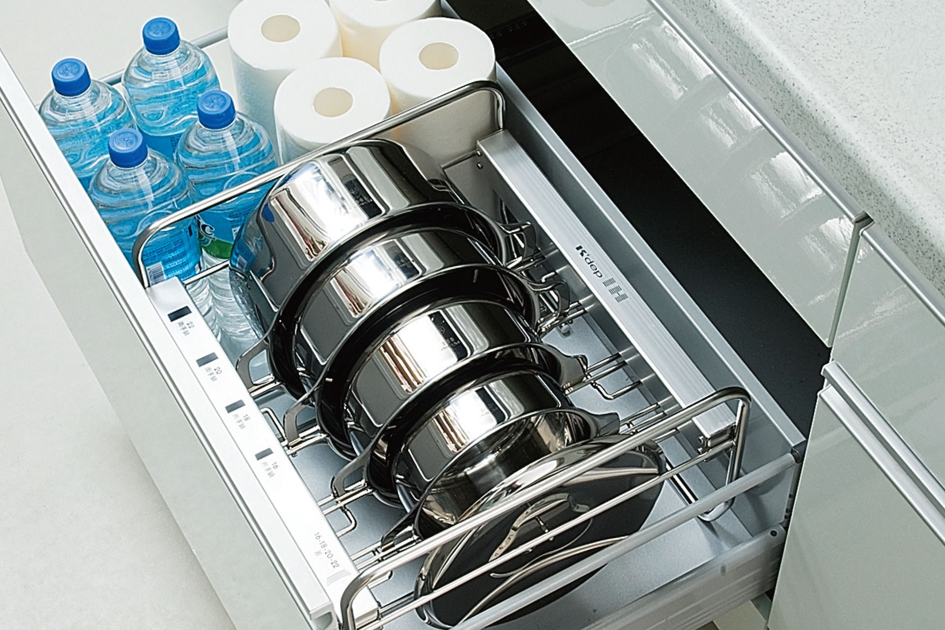 設置は簡単、ラックごと引き出しに入れるだけで、今お使いのキッチンの収納スペースを、格段にレベルアップします。